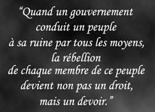 Pourtant la rébellion coule de source autant que nous avons la bave aux lèvres d'agir contre ce ceux qui nous ruine et qui d'une manière Honteuse nous portent tout droit à une fin certaine de notre identité! Alors! Que faut il pour motiver le peuple Français? Utiliser cette citation et se décider de la suivre à la lettre? Attendre? Attendre et encore se laisser piétiner? perdre nos valeurs? notre religion? Notre nourriture? Nos futures générations et tant d'autre choses encore?